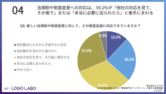 「新しい法規制や制度変更に対して、どの程度迅速に対応できていますか?」という質問では、「他社の対応を見て、その後で」(32.2%)や「本当に必要に迫られたら」(27.0%)と回答した企業が合わせて59.2%に上りました。他社の動向を見てから対応する企業が多く、法規制への対応が後手に回っている可能性があります。