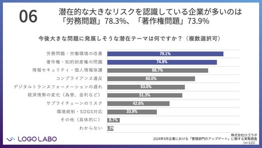 「今後大きな問題に発展する可能性があるテーマは何ですか?」という質問では、「労務問題・労働環境の改善」(79.1%)や「著作権・知的財産権の問題」(74.8%)を挙げる企業が多くありました。これらのリスクに対する対策が急務であることが示されています。
