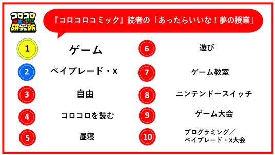 「あったら良いなと思う“夢の授業”」について尋ねると、ダントツの第1位は「ゲーム」(23.9%)でした。TOP10内には、ほかにも第7位「ゲーム教室」(1.9%)、第9位「ゲーム大会」(1.7%)と、ゲーム関連の授業が上がっており、コロコロコミック読者の頭の中はゲームでいっぱいなのでしょう。