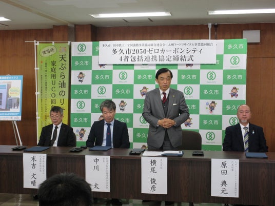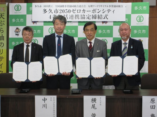 Roa(d)cal SDGs Projectを通じたゼロカーボンシティ実現への取組を多久市へ提案させていただく過程において、家庭系廃食油のリサイクルの推進を多久市として正式に決定したことを受け、廃食油リサイクルの全国団体である「全国油脂事業協同組合連合会」と、傘下組合である「九州フードリサイクル事業協同組合」の4者での包括連携協定を締結する運びとなりました。