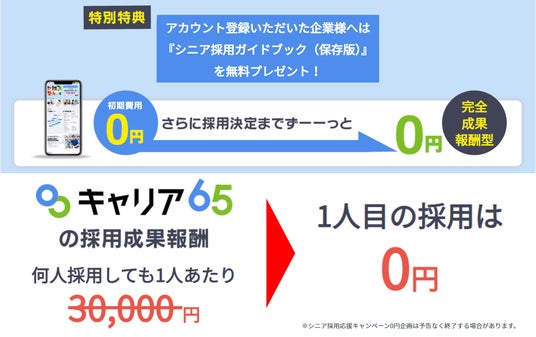 こうした背景を受け、シニア向け求人サイト「キャリア65」では、1社でも多くの企業にシニア採用にチャレンジしていただきたいという強い想いから、新たなプランをスタートします。