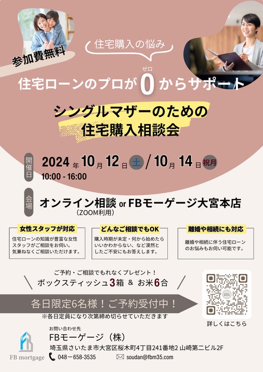 フラット35代理店事業を行う、FBモーゲージ株式会社(本社:埼玉県さいたま市、代表取締役:根石 高宏)は10月12日(土)・14日(月)に当社の大宮本店及びオンラインにて「シングルマザーのための住宅購入相談会」を開催いたします。住宅購入やローンに関する悩みを抱えるシングルマザーの方に、専門の女性スタッフが対応し、資金計画やローンの借り換えまで、安心して住宅購入を行うためのアドバイスをさせていただきます。