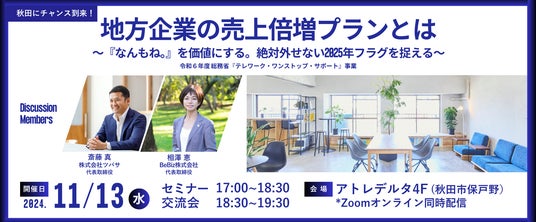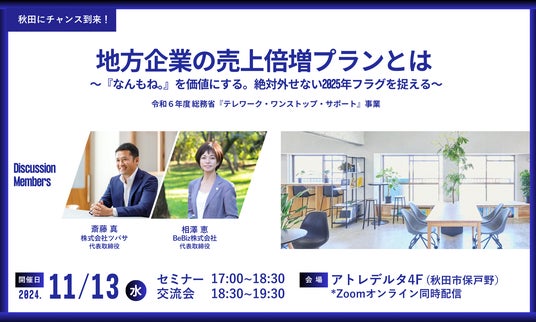 総務省「テレワーク・ワンストップ・サポート事業」に基づき、秋田における新たな働き方と地方の産業活性化を目指し、自治体や地域産業振興機関と連携しながら、BeBizとRevitalizeが共同で企画開催したのが、以下3回シリーズのセミナーです。