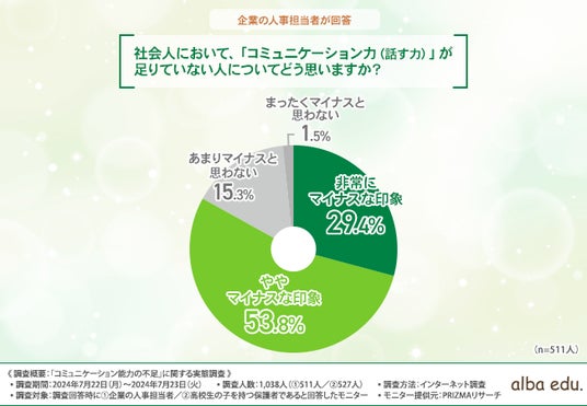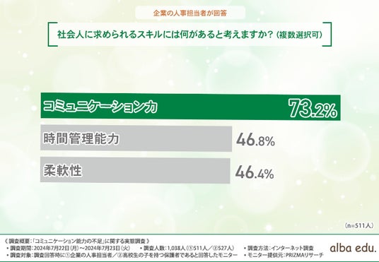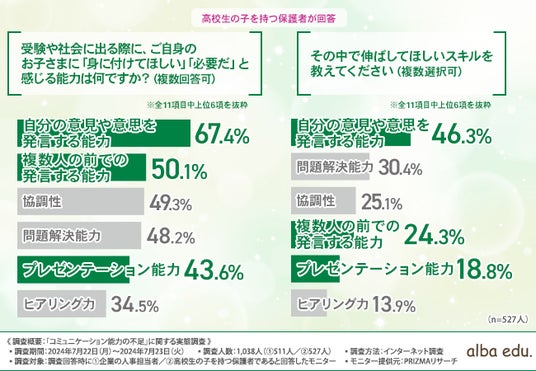 今回、一般社団法人アルバ・エデュ(https://www.alba-edu.org/)は、1.企業の人事担当者/2.高校生の子を持つ保護者を対象に、「コミュニケーション力」に関する実態調査を実施しました。