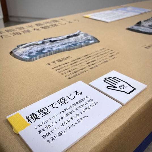 (2)能登半島地震で隆起した海岸の3D模型今年1月に起こった能登半島地震によって隆起した地形の様子を3Dプリンタで印刷した立体模型を展示しています。海岸の様子やその周辺の民家の並び、地面の凹凸など3Dプリンタならではの精密さをその手で感じていただけます。360°パノラマで撮影された画像と模型を見比べ自然のスケールの大きさを想像してみてください。