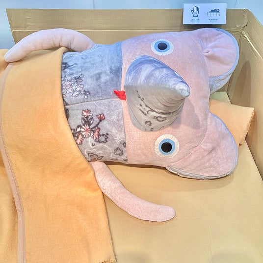 (4)見て、触って、感じる防災展示室入り口で皆様をお迎えするダンボールベッドの上には、災害支援に使われた毛布を素材としたぬいぐるみ作品を展示しています。被災時など不安な状況に陥ったとき、ぬいぐるみなどやわらかいものを抱きしめることで、その気持ちを軽減することが出来ます。写真はねずみのぬいぐるみですが、会期中2~3週間ごとに展示替えを行いますので、ぜひ一緒に寝転んだり、抱きしめたりしてみてください。