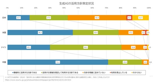 しかし、未だ国内企業における生成AI利用率は50%以下と他国と比較して低調である一方、利用検討は90%近くに上っています。