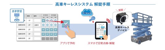 高車キーレスシステムは、高所作業車の予約調整・位置・稼働状況の管理が実施できる「高車管理」アプリの予約者のみにデジタルキーを発行して、鍵の解錠を制御できるシステムです。高車の鍵の管理が不要となり、点検終了が解錠条件となるデジタル日常点検機能と連動させれば、日常点検記録の管理も効率化されます。