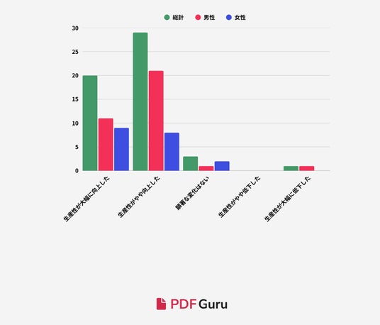 男女別では、男性34名、女性19名のうち、女性のほうが「大幅に向上した」と感じる割合が高く(女性約47%、男性約32%)、男性は「やや向上した」と答える傾向が強いようです(男性約62%、女性約42%)。また、「顕著な変化はない」と回答した割合は女性のほうが高く(女性約11%、男性約3%)、「大幅に低下した」と回答したのは男性のみでした。