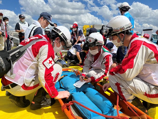 赤十字は、災害があったときにはすぐに赤十字救護班を派遣し、救護活動にあたります。この訓練には、今後赤十字救護員となる医療スタッフを中心に96人が参加。県内外の被災地において行政機関や他の救護団体と協力しながらスムーズに活動を行えるよう、知識・技術の向上を目指します。