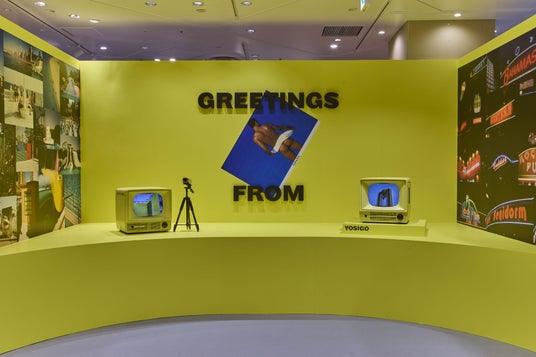 最後の「GREETINGS FROM」ゾーンは、黄色を基調としたアグレッシブなスペース。レトロテイストのテレビに自身を映せるようになっていて、来場者も映像の中に映り込みお楽しみ頂く事ができます。