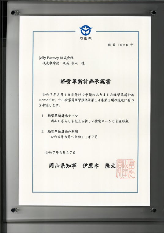 Jolly Factory株式会社(本社:岡山県倉敷市、代表取締役:丸尾崇人)は、2025年3月27日付で岡山県より経営革新計画の承認(経第1020号)を受けました。