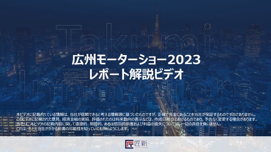 2023年11月17日から26日にかけて行われた「広州モーターショー2023」。今回は、その独自レポートを匠新が作成し、無料でご提供。イベントの基本情報から、中国自動車最新トレンド、新勢力ブランドやBATH+αといった出展企業の分析までをカバーしております。ご興味のある方は、ぜひご覧ください。