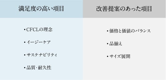 CFCLでは、理念やポリシーに沿った価値提供を実現できているかを顧客からのフィードバック/サーベイで定期的に確認しています。その結果を私たちのクリエイションや経営に反映させることで、顧客および社会により良い製品と価値提供を促進しています。