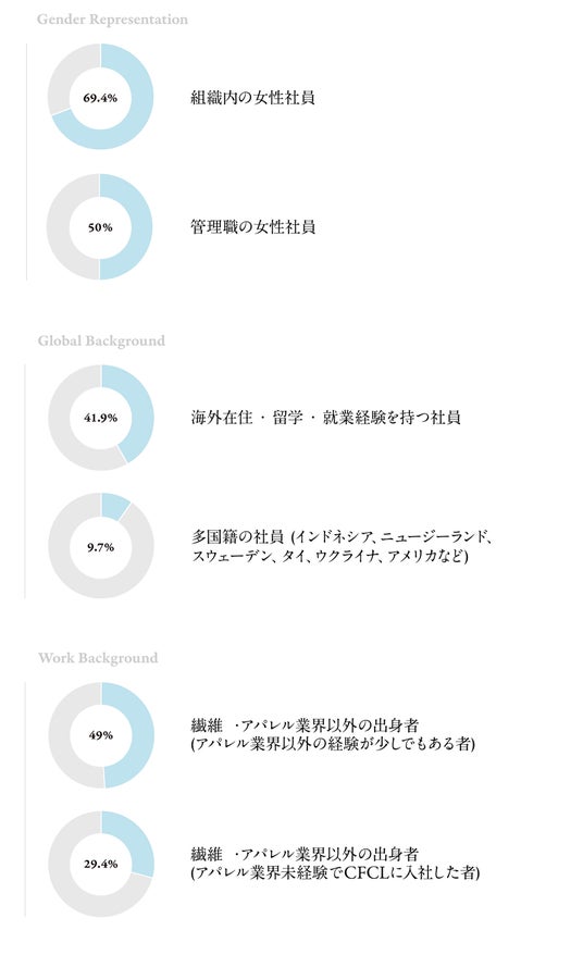 CFCLは海外への事業展開を積極的に行い、世界に通用するグローバル企業を目指しています。このことを実現するためには、社員のパフォーマンス維持やウェルネス向上の観点だけでなく、世界中の優秀な人材の獲得の観点においても、社内におけるJEDI (Justice=正義・Equity=公平性・Diversity=多様性・Inclusion=包括性) の推進が不可欠と考えています。CFCLは多様なバックグラウンドを持つスタッフの採用を進めており、現状では以下のような構成となっています。 (図3)