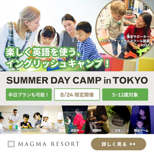 東京都渋谷区広尾を本拠地とする株式会社MAGMAは、2024年8月21日(水)に5歳~12歳を対象とした「SUMMER DAY CAMP」内でインターナショナルスクールの園長先生として活躍しているROSAさんと都内広尾にてコラボ開催します。体を動かす戦闘ゲームや逃走ゲームからクラフト工房、サイエンス教室、フード作りなど1日に7つのアクティビティを体験しつつ、英語も学べると非日常体験を。子どもたちはワクワク楽しい一日で、普段なかなか学ぶことのできないコミュニケーション能力や勇気、自信、そして探究を育みます。