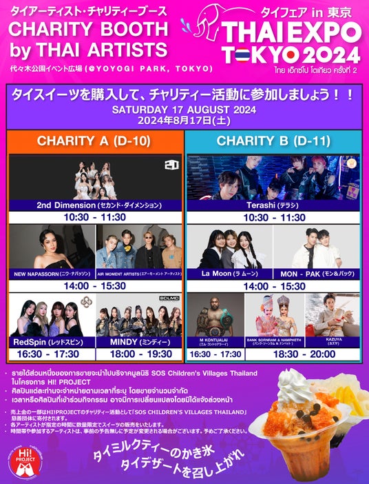 会場内のチャリティブースには豪華アーティストが勢揃い。アーティスト達から、タイスイーツ「タイミルクティーのかき氷」「パン・エン」を購入いただくと、収益金の一部はタイの“SOS Children's Villages Thai Foundation(https://www.sosjapan.org/sos-childrensvillages) 、また能登半島震災復興支援団体へと寄付されます。