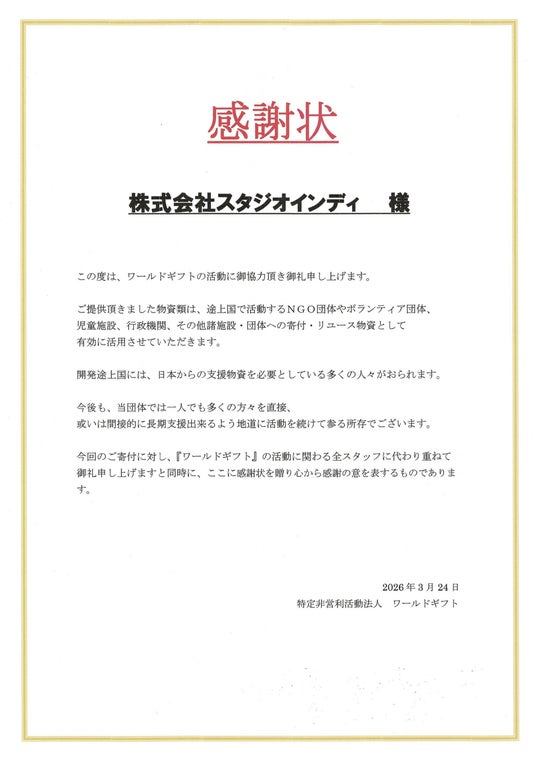 スタジオインディの活動に対し、寄付先のNPO法人ワールドギフトより、以下の感謝状を拝受しました。