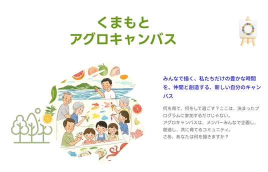「くまもとアグロキャンバス」は、これまでの取り組みを一歩進め、より多様な人々が継続的に天草と関わり、地域課題の解決や新たな魅力創造に主体的に参加できる「共創の場」を提供することを目的としています。「30年後も、子どもたちの笑い声が響くまち」というビジョンの実現に向け、地域内外の人々と共に天草の未来を描きます。