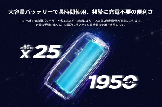 「Fasoul Stellar」はFasoulシリーズの中で最も多く、最大25本分まで連続使用できるモデルです。1950mAhの大容量バッテリーと省エネルギー設計により、充電の手間を減らし、日常的に使いやすい長時間の使用を実現しています。