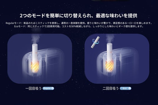 「Fasoul Stellar」はレギュラーモードとエコモードの2つの喫煙モードを備えています。モードの切り替えは、本体底部のボタンを3回連続で押すことで簡単に行えます。なお、2回目の吸引に関しては、初回をIQOS ILUMAで使用したスティック、Fasoulで初回を行ったスティック、どちらの場合でも吸引可能です。ただし、スティックを挿入する前に、必ず希望のモードを選択しておく必要があります。