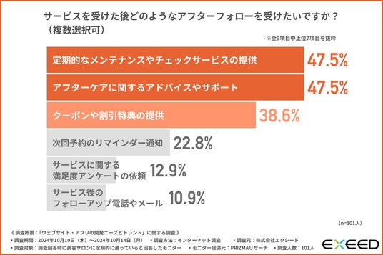 そこで、「サービスを受けた後どのようなアフターフォローを受けたいですか?」と質問したところ、『定期的なメンテナンスやチェックサービスの提供(47.5%)』『アフターケアに関するアドバイスやサポート(47.5%)』と回答した方が最も多く、次いで『クーポンや割引特典の提供(38.6%)』となりました。