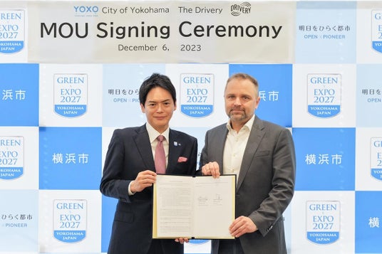 2023年12月6日、横浜市と The Drivery が基本合意書(MoU)を締結。山中竹春横浜市長(左)とティモン・ルップ The Drivery 創業者兼CEO(右)((C) 横浜市 2023)