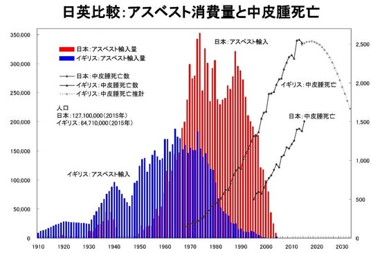 日本では1950~70年代の高度成長期にアスベスト利用のピークを迎えました。海外ではそれ以前からアスベストの利用が進んでいて、英国もその一つでした。そのため、英国ではアスベストの被害が日本よりも約20年早く顕在化しています。近年の中皮腫の死亡患者数は日本で年1500人程度、英国で年2500人弱。日本はピーク時に英国の約1.6倍ものアスベストを輸入していましたから、日本の中皮腫の死亡患者数は今後も増加し、少なくとも年間3000人を超えることが予測されています。それがデータをもとに、冷静に予測し得る未来です。