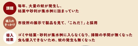大阪府高槻市の野見神社に全面的に導入したところ「景観を損ねない蓋」「蚊の発生が激減した」として高く評価され、飛散する砂利や落ち葉の流入も防ぎ、景観美と衛生管理の両立が可能になっています。