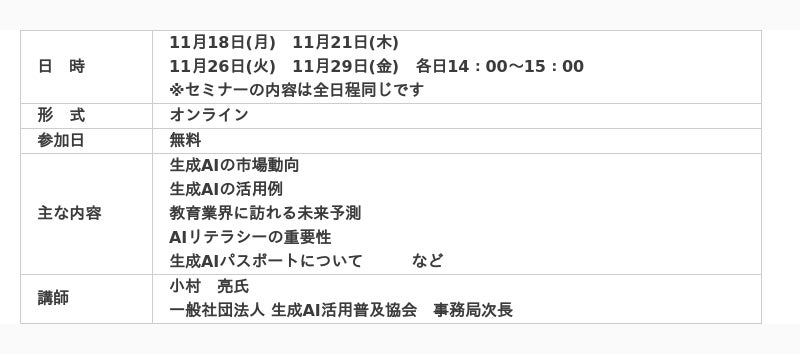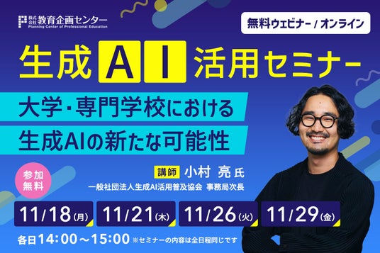 教育機関に向けたサービスを提供している株式会社教育企画センター(代表取締役社長:櫻田勝久、本社東京都千代田区)は、学校関係者を対象とした生成AI活用セミナー(大学・専門学校における生成AIの新たな可能性)を11月18日・21日・26日・29日に開催することをお知らせいたします。