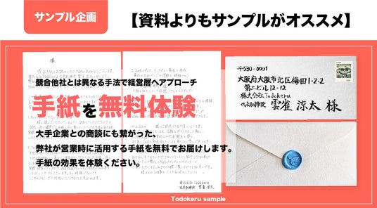 日本を代表するレターマーケティング会社を目指す株式会社Todokeruが、これまで数多くの大手企業様、中小ベンチャー企業様との商談機会に繋がった手紙を無料で体験しませんか?
