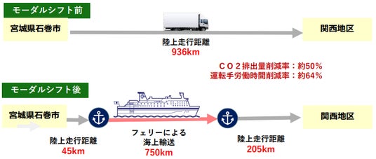 - 長距離の幹線輸送をフェリーによる海上輸送に転換し、陸上走行距離を短縮することで、ドライバーの拘束時間を大幅に短縮。ドライバーの日帰り勤務の定着と採用力強化を実現。