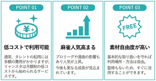 リャンスタは、人気プロ雀士の素材、肖像権を月額料金で利用できるサービスです。麻雀業界はプロリーグや漫画の影響もあり人気が上昇。今後も更なる成長が見込まれています。