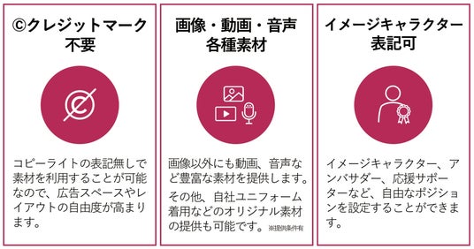 リャンスタの提供素材は、基本的な取り扱いを守れば利用場所や方法が自由。取り扱いに課されるルールはほとんどないため、自由度の高いプロモーションが可能です。また、広告物の監修がないため、素材をすぐに活用することができます。