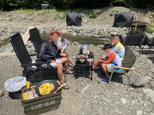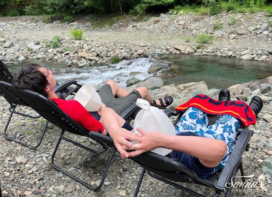 テントサウナパークの川沿いでサウナ後にトトノウ様子