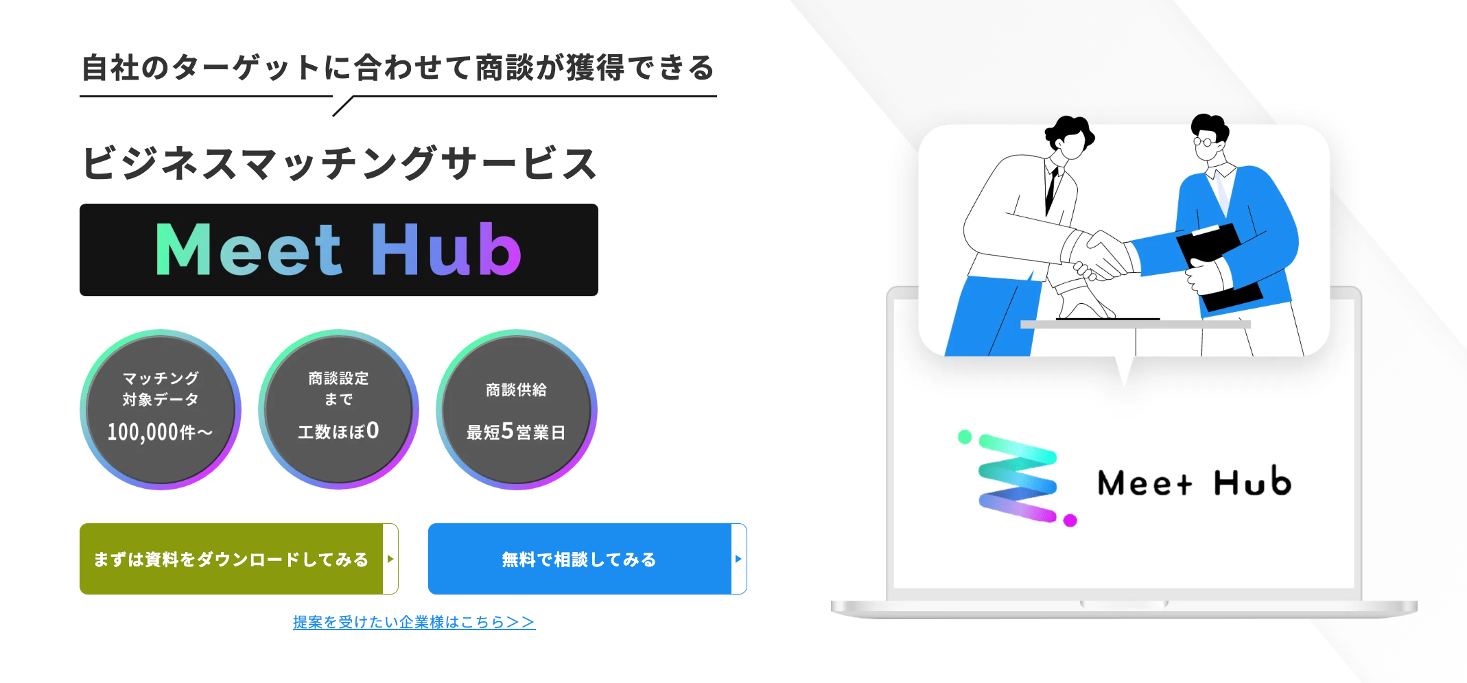 本サービスは、弊社がMeet Hubというサービスを通じて顧客様のサービスのご紹介やご案内を実施の上で、ご興味を持っていただいた企業様を顧客とマッチングする、というサービスになります。