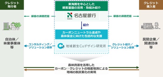 2社が連携することで、地方公共団体や民間企業の森林管理に関する課題把握や伴走支援を行うとともに、名古屋銀行の顧客基盤における、カーボン・オフセット活用ニーズを有する民間企業等や、カーボン・クレジット創出ニーズを有する地方公共団体等に対して、地域創生Coデザイン研究所がソリューションやコンサルティング※2の提供を通じた支援を行うことにより、カーボン・クレジットの地産地消を進めてまいります。