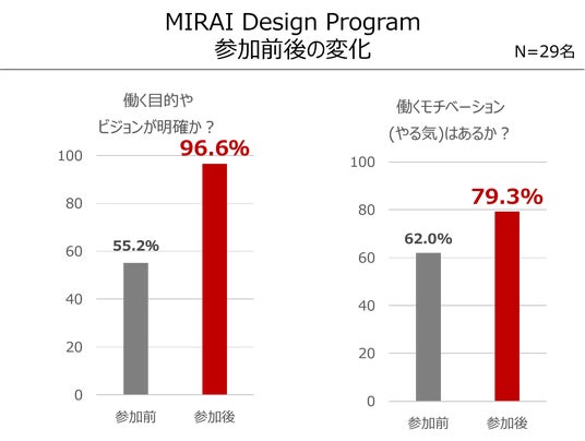 また、「働く目的やビジョンが明確である」と回答した参加者は、研修前の55.2%から96.6%に増加。ご参加いただいたほぼ全員の先生方にビジョンを明確化していただくことができました。さらに、「働くモチベーションが高い」と回答した参加者も、62.0%から79.3%に増加しました。