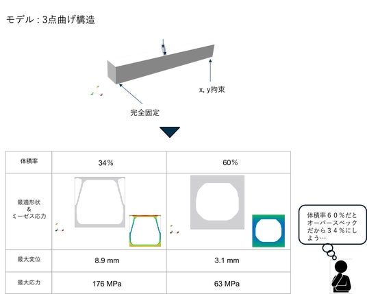材料の体積率を変更して複数回最適計算を実施することで、結果を比較し、設計案を検討することが可能となります。