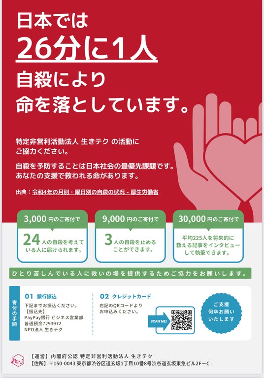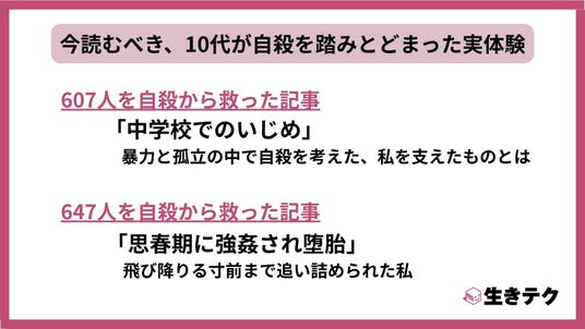 NPO法人 生きテク(東京都渋谷区、代表理事オキタリュウイチ)は、自殺防止の啓蒙活動として、「今読むべき『10代が自殺を踏みとどまった実体験』」をテーマに、独自のインタビュー記事を選出した。さらに、「生きテク編集部大賞 2025」を発表する。