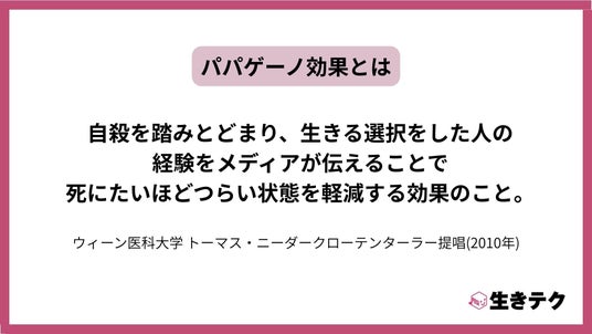 辛い状態を乗り越えた人の経験談が、いま生き辛さを抱える人の生きる力になることが、科学的に証明されつつあります。それを「パパゲーノ効果」と言います(Niederkrotenthaler, ea al., 2010)。