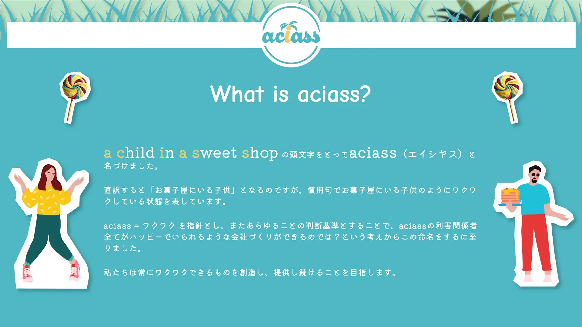 aciass = ワクワク を指針とし、またあらゆることの判断基準とすることで、aciassの利害関係者全てがハッピーでいられるような会社づくりができるのでは?という考えからこの命名をするに至りました。