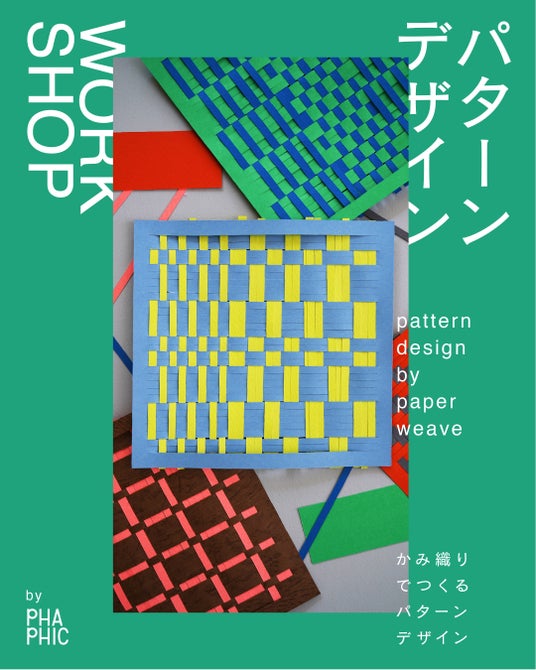タテ・ヨコ2色の紙を織り上げてオリジナルのパターン(柄)をつくるワークショップを開催。PHAPHICディレクター兼デザイナー・イシガミと一緒に、テキスタイルデザインとグラフィックデザインの要素を手を動かしながら体験いただきます。大人から子どもまで、どなたでも気軽に参加いただけるワークショップです。