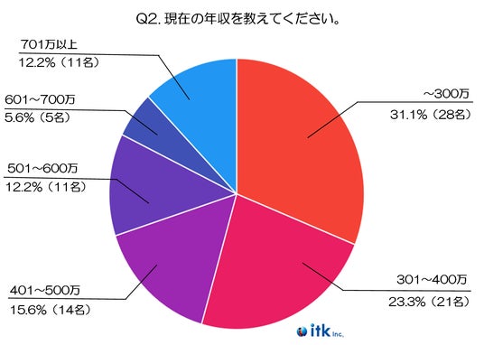 「~300万」が31.1%で最多、続いて「301~400万」が23.3%、「401~500万」が15.6%と、年収500万円以下に約7割が集中している点が際立ちます。