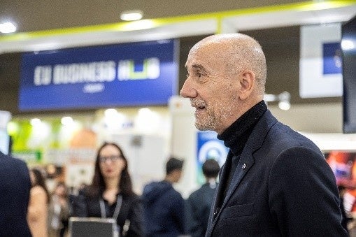 ジャン・エリック・パケ駐日EU大使がEUグリーントランジションパビリオンを訪問し、製品やサービスを展示している企業代表者らと会談を行いました