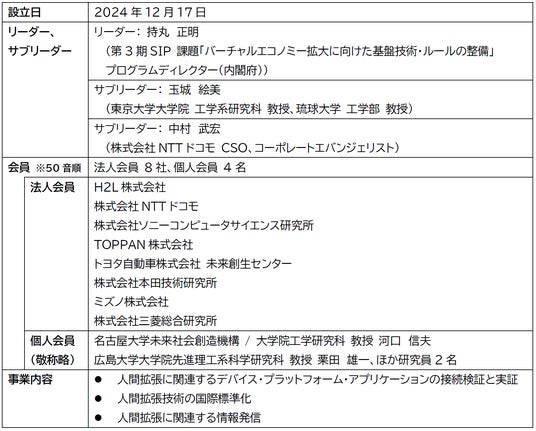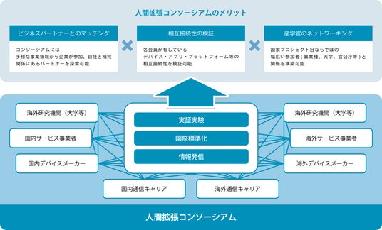参加する企業と学術専門家が連携し、人間拡張技術の構成要素であるアプリケーション、デバイス、プラットフォームの実証・接続性の検証や、国際標準化、シンポジウムの開催やホワイトペーパーの発行などによる情報発信といった活動に取り組んでいきます。