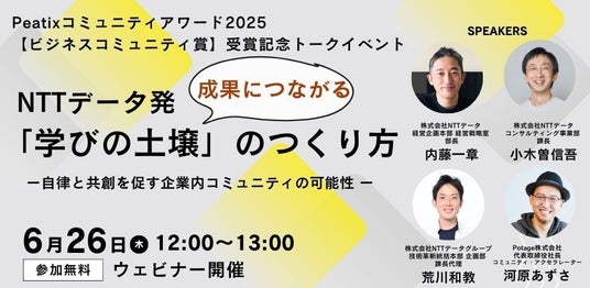 株式会社NTTデータ(代表取締役社長:佐々木裕、以下:NTTデータ)のCommunity Leader's Community(以下:CLC)は、5月28日(水) SCC千駄ヶ谷にて開催された「Peatix コミュニティアワード2025」にて【ビジネスコミュニティ】賞を受賞。この取り組みには、企業や自治体のビジョン浸透とファン形成を「コミュニティ思考」で支援するPotage株式会社(本社:東京都豊島区、代表取締役:河原あずさ、以下:Potage)が構想段階から企画運用まで伴走。自律的な学びの土壌をつくり、現場から経営の意思決定を動かす組織文化づくりに貢献しました。