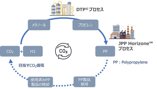 本共同調査では、カーボンリサイクルによる資源循環可能なポリプロピレンの製造技術の構築に向けて、日揮グローバルおよび三菱ケミカル株式会社が共同で保有するメタノールからプロピレンを製造する「DTP(R)プロセス※1」と、日本ポリプロが保有するプロピレンからポリプロピレンを製造する「JPP Horizone(TM)プロセス※2」の融合により、水素とCO2から製造されるカーボンリサイクル・メタノールを出発原料としてポリプロピレンまでを製造する融合プロセス全体の効率化を図ることで、製品ライフサイクルにおけるカーボンニュートラル、サーキュラーエコノミーの実現とプロセスの経済性の向上を目指します。