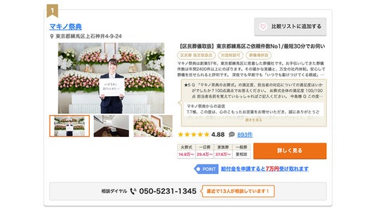 葬儀専門ポータル「葬儀の口コミ」でマキノ祭典(株式会社まきの、本社:東京都練馬区、代表取締役:牧野昌克)が1位に(7月22日11:00 時点)。