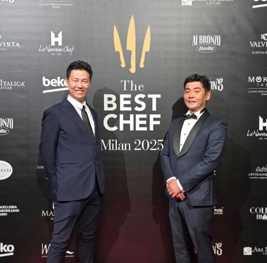 「The Best Chef 2025」にて、“World-Class(世界水準)”の〈2ナイフ〉を受賞したエグゼクティブシェフ 行方 崇(左)と上田 寿夫(右)